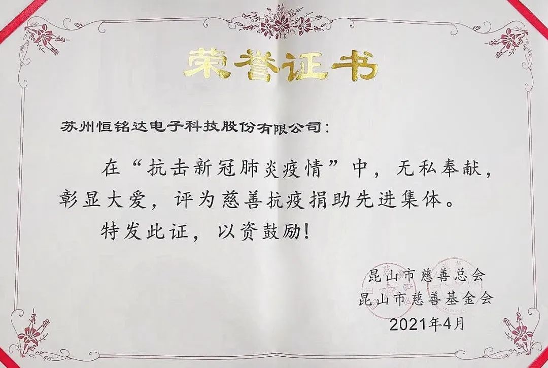 為弘揚(yáng)戰(zhàn)役精神、表彰社會各界奉獻(xiàn)愛心,回報社會的慈行善舉,對恒銘達(dá)在疫情發(fā)生后組織捐款捐物、為抗擊疫情做出的積極貢獻(xiàn),表彰并授予“慈善抗疫捐助先進(jìn)集體”榮譽(yù)稱號。